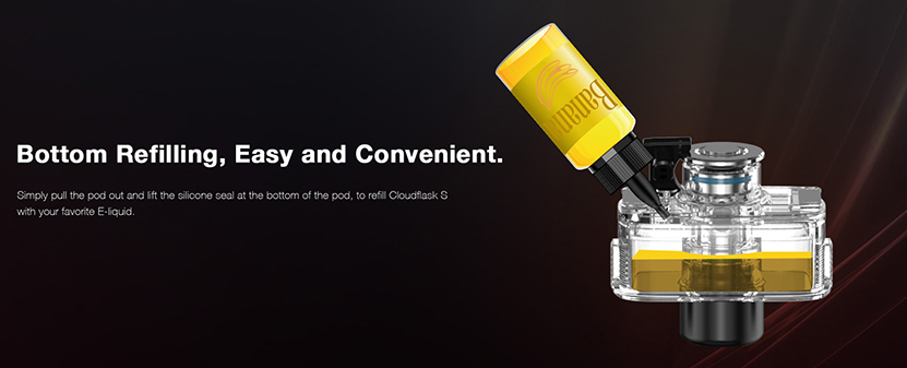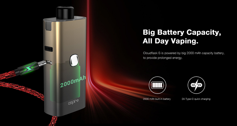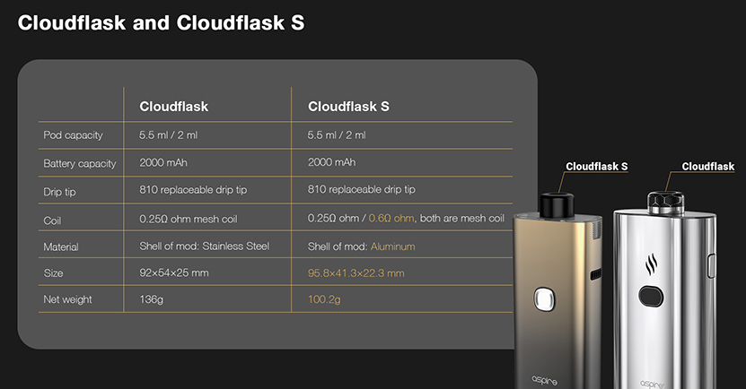 The Cloudflask Pod is a 5.5ml bottom-filling pod. The Cloudflask S has a 2000mAh battery and a 2A type-c quick charging connection.