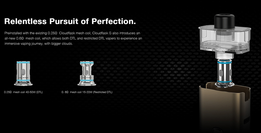 Cloudflask S supports both a 0.25ohm Cloudflask mesh coil for DTL vaping and an all-new 0.6ohm mesh coil for restricted DTL vaping. When the unique double-sided air inlets are combined with Bypass output, you can enjoy a wonderful vaping experience. The Malaysia Version includes a leather case, but the Standard Version does not.