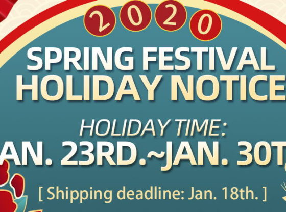Dear Customers: To celebrate the coming Spring Festival(the Chinese New Year), we are going to be on holiday from Jan. 23rd to Jan. 30th, GMT+8. During the holiday,…