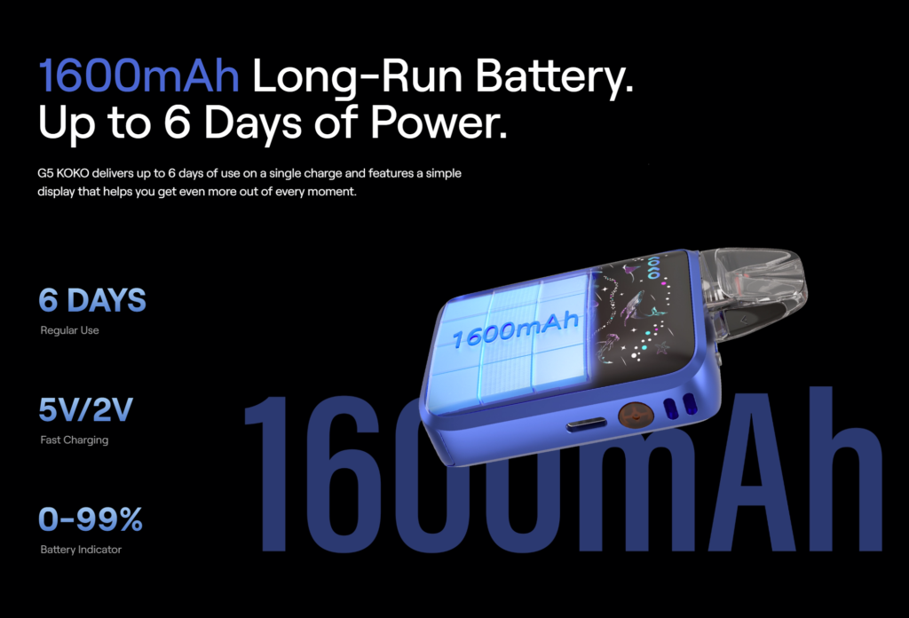 Equipped with a 1600mAh built-in battery, the Caliburn G5 KOKO is built to support extended daily use. The larger battery capacity helps reduce frequent recharging and keeps performance stable throughout the day, making it suitable for users with active routines