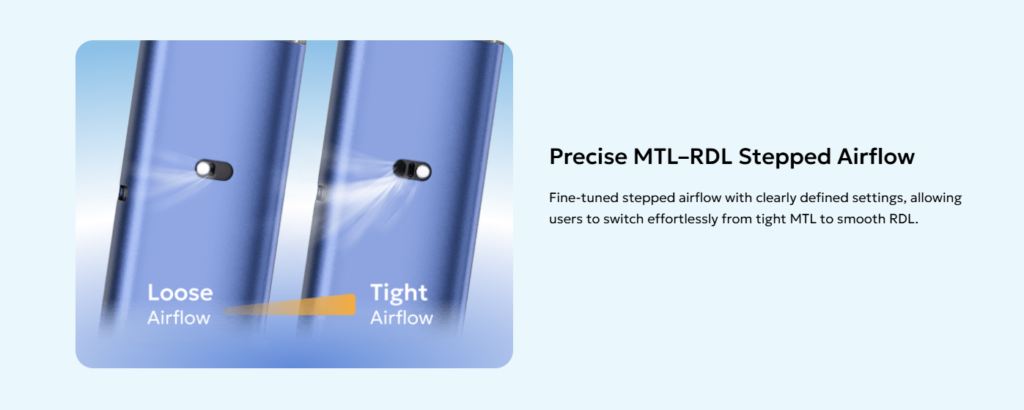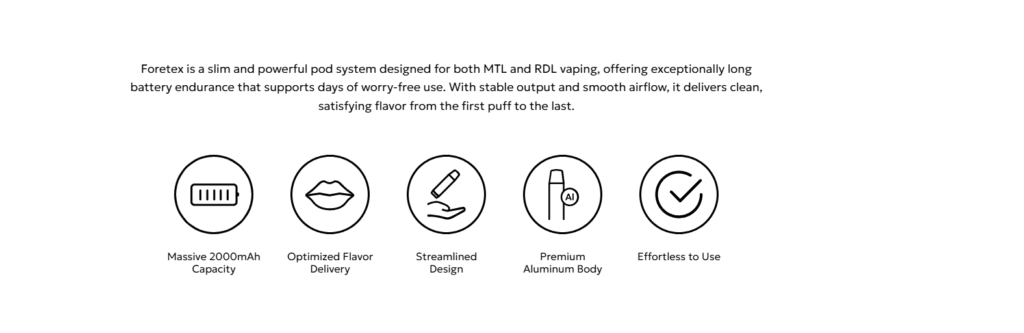The Foretex Pod Kit supports vaping from MTL (mouth-to-lung) to RDL (restricted direct-lung), allowing you to adjust your experience according to your preferences. It’s flexible enough to meet different vaping styles in one device.