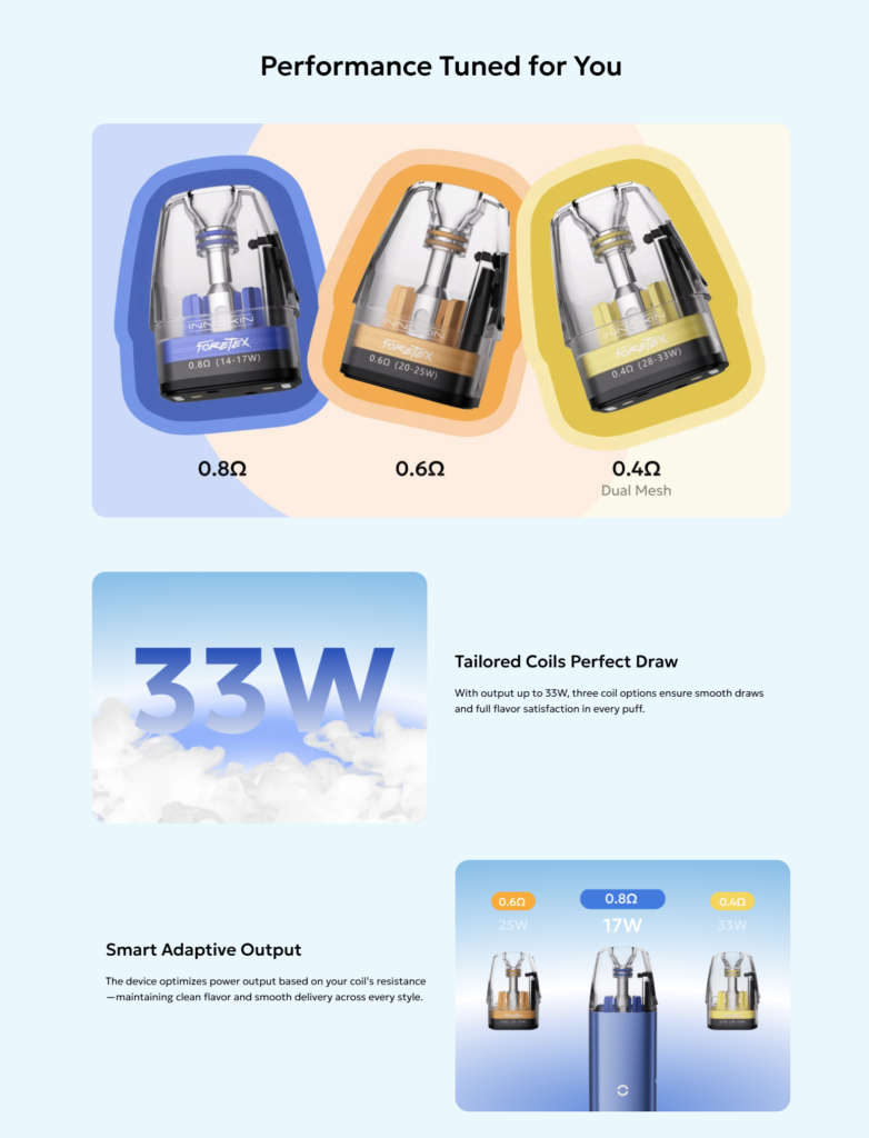 With a maximum output of 33W, this pod kit delivers smooth and satisfying vapor. It handles a wide range of e-liquids effectively, making it suitable for both new and experienced users.