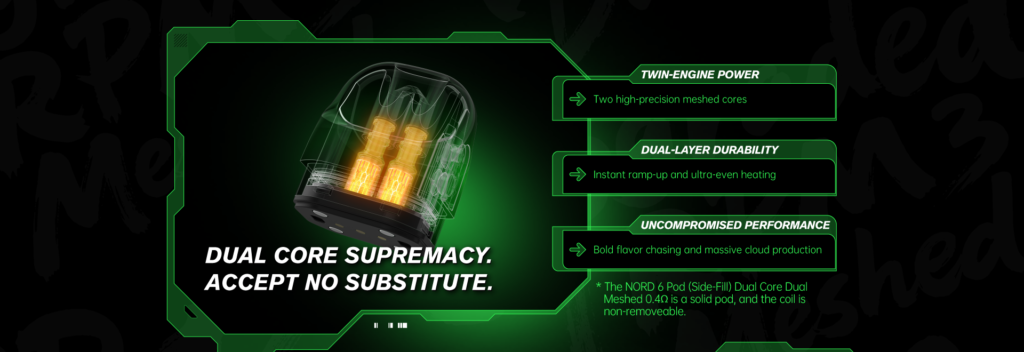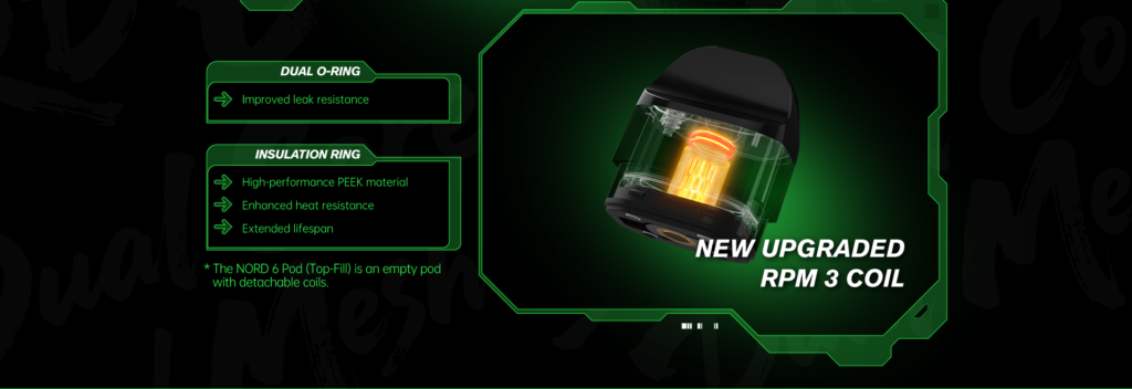 Equipped with upgraded RPM 3 coils, the Nord 6 focuses on consistent flavor and vapor production. The dual-core dual-meshed design improves heating efficiency and helps deliver a more even vaping experience. These coils are suitable for direct-lung vaping and are designed to handle higher wattage while maintaining stable performance.