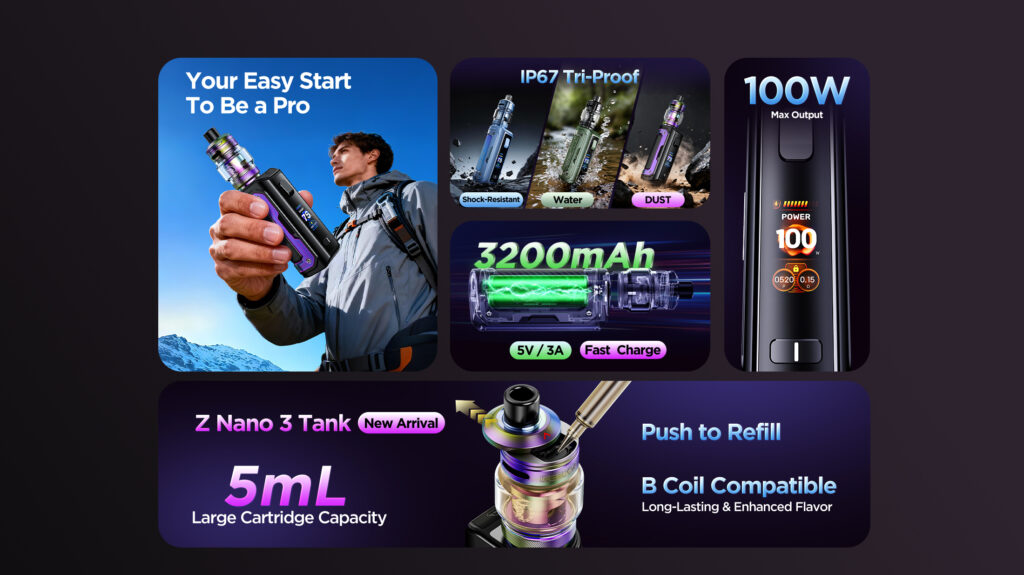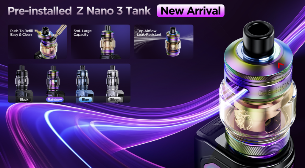 Paired with a 5ml Z Nano 3 Tank, the kit uses a top airflow design that helps reduce leakage and supports smooth airflow control. The tank is easy to refill and well-suited for consistent daily use.