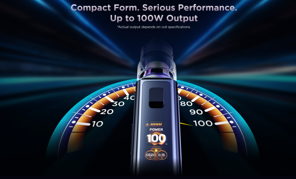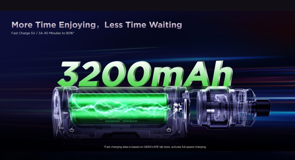 The device features a 3200mAh built-in battery with up to 100W max output. This setup provides stable power for extended sessions while supporting various vaping styles.