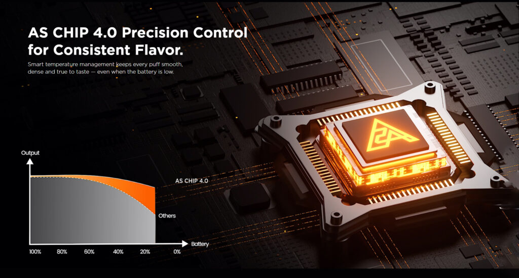 Powered by the AS Chip 4.0, the device delivers precise power control and stable output. This chipset is designed to maintain consistent performance across different settings.