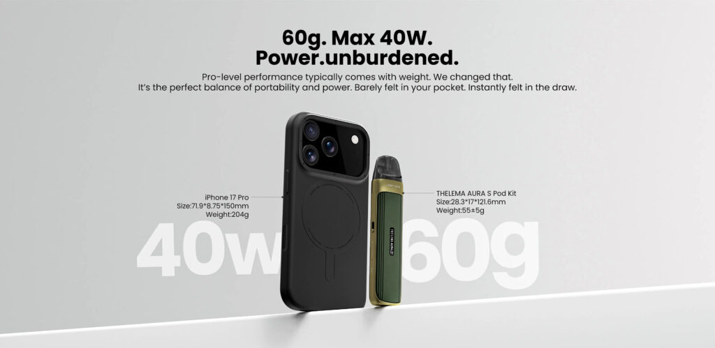 Weighing only 60g and offering up to 40W maximum output, the Thelema Aura S is easy to carry while still providing enough power for most pod-style vaping needs. Its compact form makes it suitable for both new users and experienced vapers who prefer a simple yet capable device.