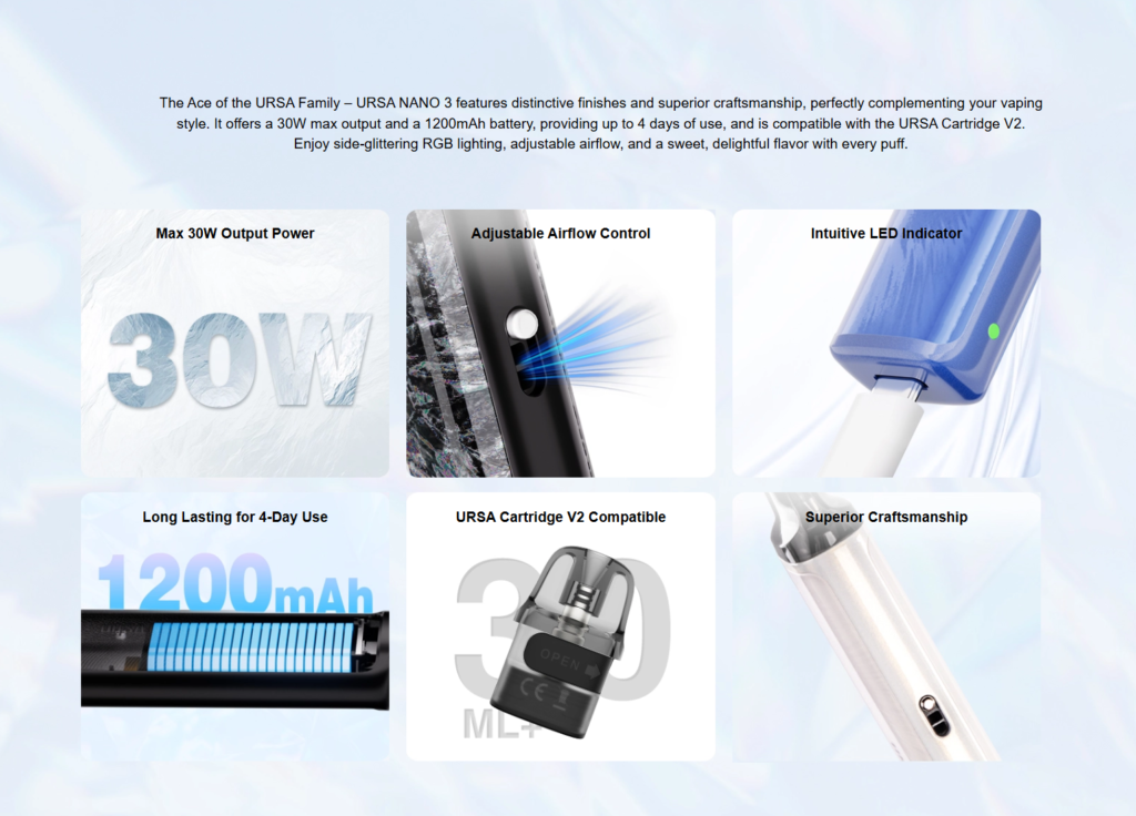 Power is key when it comes to a satisfying vaping experience, and the Ursa Nano 3 doesn’t disappoint. Equipped with a 1200mAh battery, this device offers long-lasting performance, perfect for all-day vaping. With a maximum output of 30W, you get a balanced combination of power and flavor, delivering consistent vapor production without compromising on the quality of your hit. Whether you’re on the go or just enjoying a relaxing vape session, the Ursa Nano 3 has you covered.