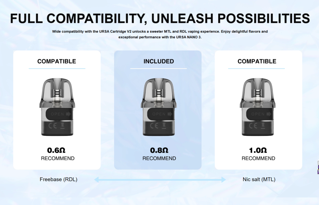 The Ursa Nano 3 is compatible with the innovative Ursa Cartridge V2, which is designed to offer a smooth and satisfying vape every time. With an easy-to-fill pod system, the Ursa Cartridge V2 allows for mess-free refills and a hassle-free experience. This compatibility ensures that you get the most out of your e-liquid, providing excellent flavor and vapor production, as well as optimal coil performance.
