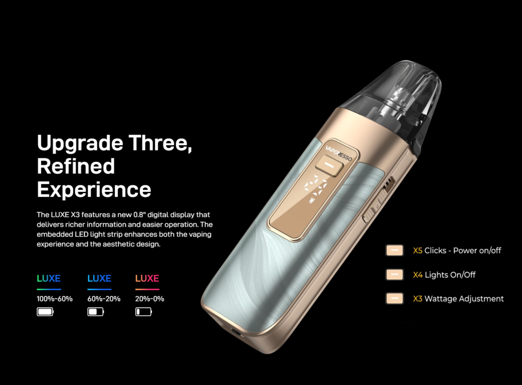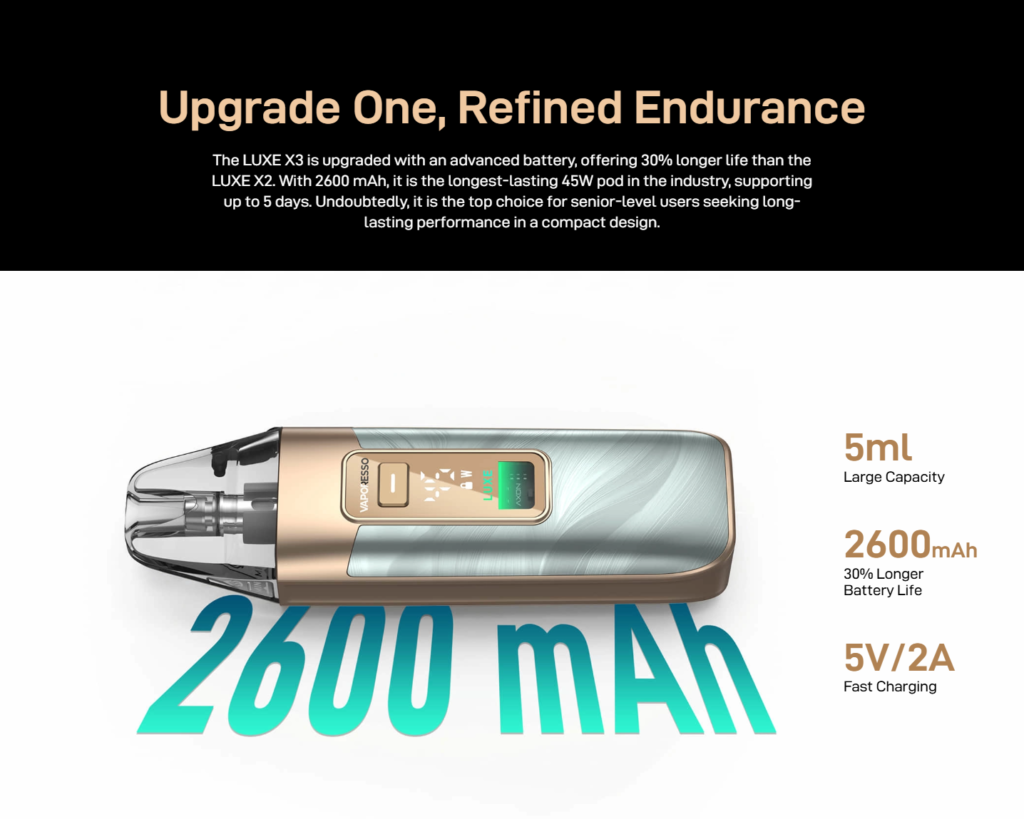 Equipped with a 5 mL pod, the LUXE X3 minimizes the need for frequent refilling. Dual Mesh technology is designed to provide consistent output and even heating, contributing to a stable and smooth experience over time.