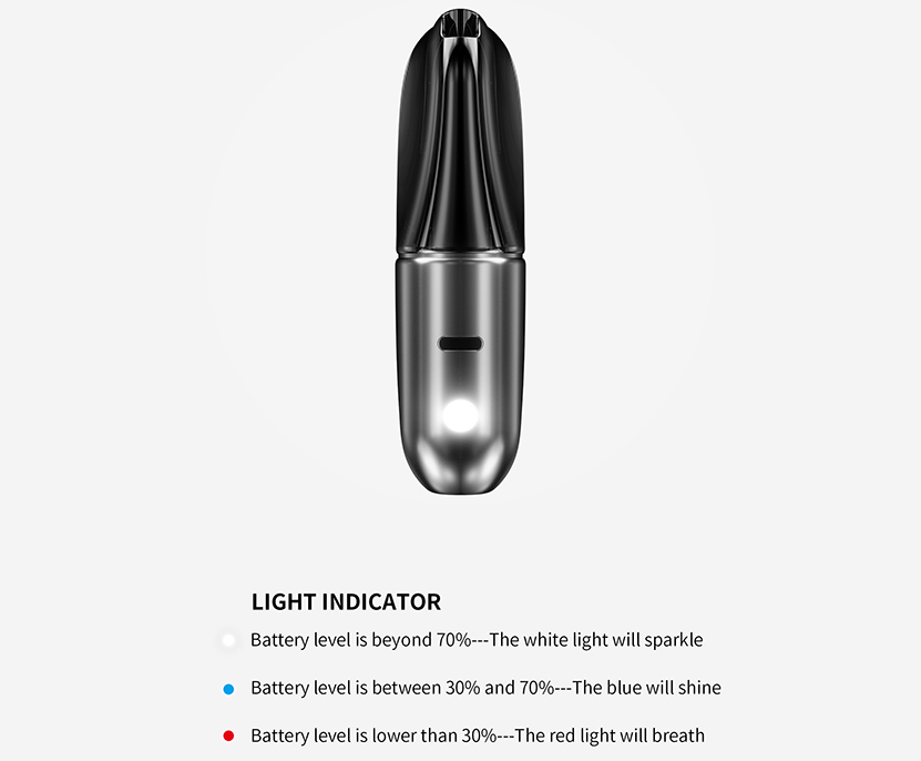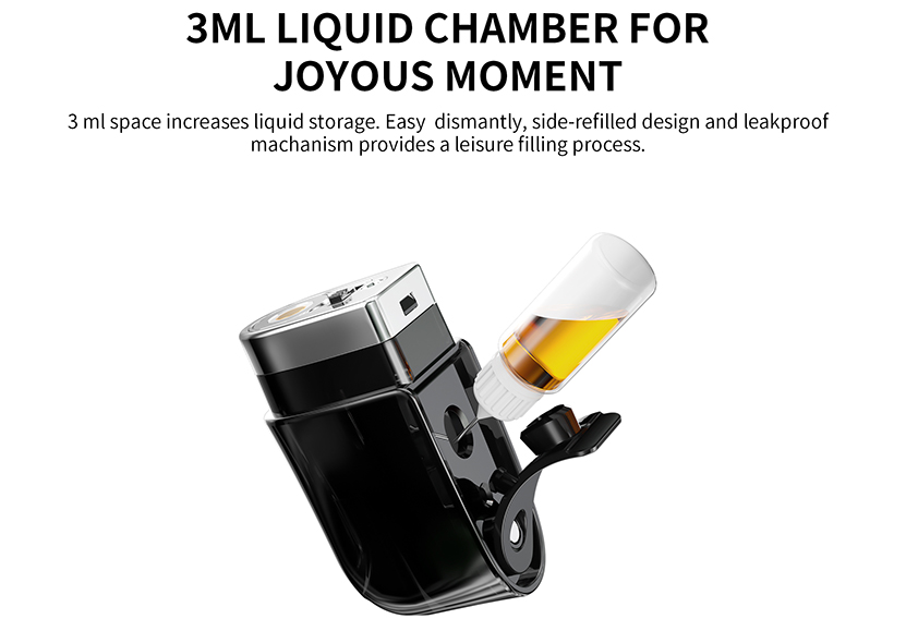 The LED indicator clearly displays the battery level. It also has a 3ml capacity, an easy side refilling method, and a leakproof mechanism.