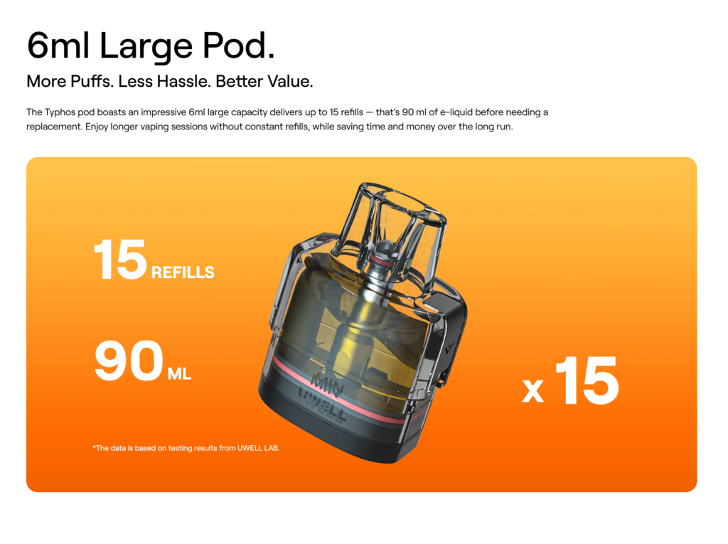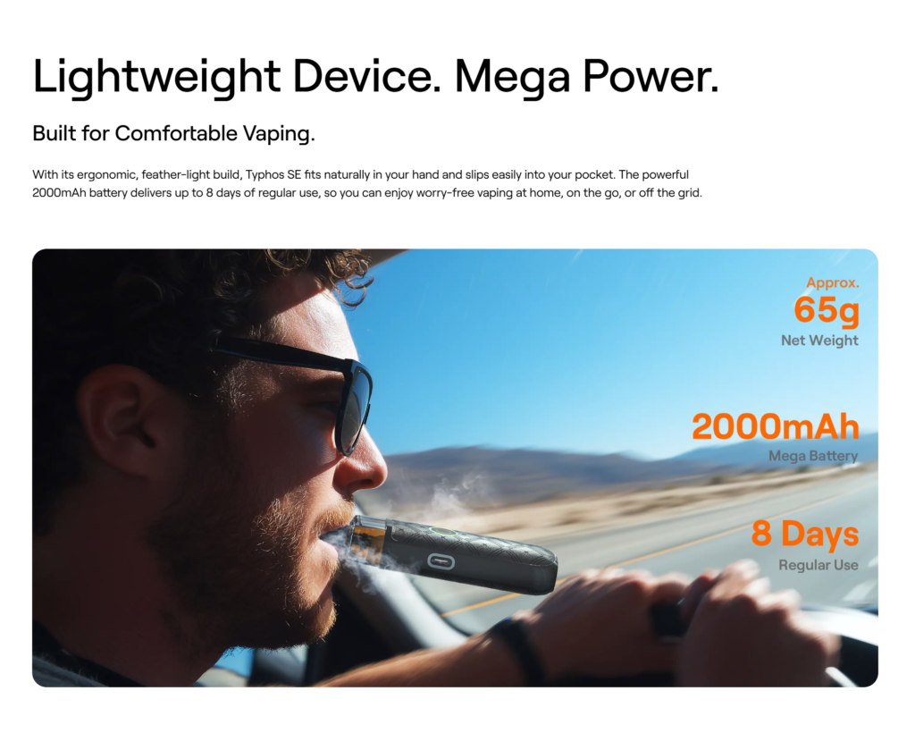 The 6ml large pod reduces the need for frequent refills, making it ideal for all-day use. Combined with a 2000mAh battery, the Typhos SE delivers extended vaping sessions without sacrificing portability or convenience.