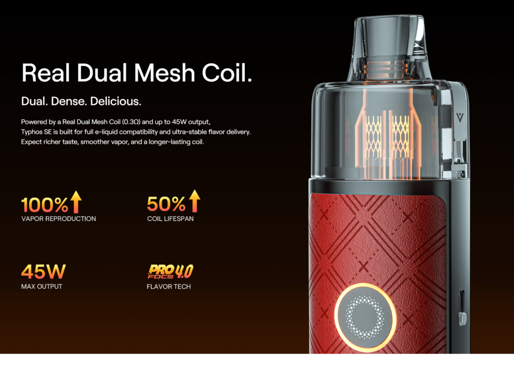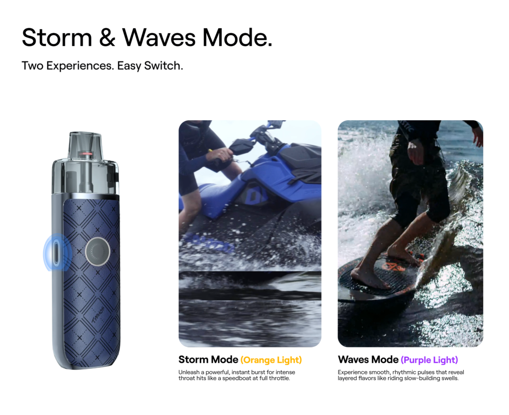 The Typhos SE features Storm Mode and Waves Mode, allowing users to tailor their vaping intensity. Its Real Dual Mesh Coil enhances flavor consistency and vapor production, while the brand-new Typhos Pod Platform ensures compatibility and efficiency.