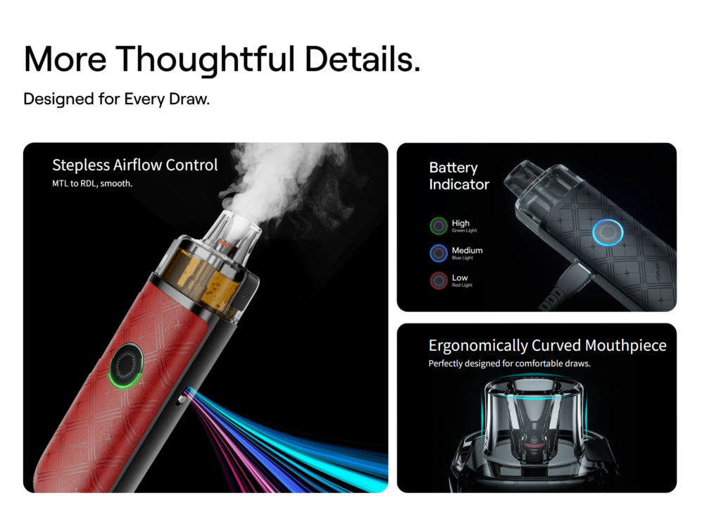 With stepless airflow control, users can fine-tune their draw resistance for a personalized experience. The battery indicator provides clear feedback, keeping you informed at a glance.