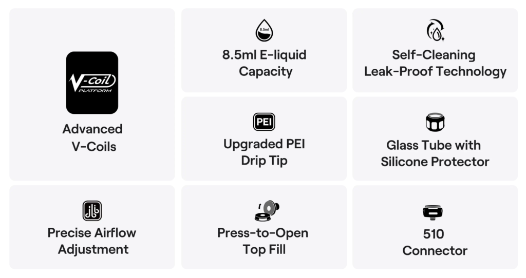 One of the standout features is its 8.5ml e-liquid capacity, perfect for long sessions without constant refilling. Paired with Uwell’s self-cleaning leak-proof design, the Valyrian IV greatly reduces condensation buildup and minimizes the mess commonly associated with high-power tanks. This internal recycling system collects and vaporizes excess e-liquid, keeping your device clean while extending coil life.