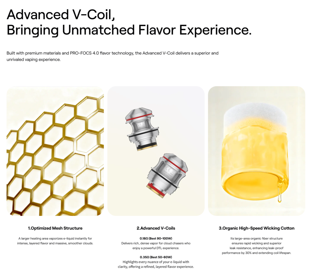 At the heart of the Valyrian IV is the advanced V-Coil series, powered by Pro-FOCS 4.0 Technology—Uwell’s latest flavor-optimization system. This technology fine-tunes heat distribution and enhances vapor density, ensuring each puff delivers rich, accurate, and satisfying flavor. Whether you prefer warm, dense clouds or smooth, restricted airflow, the V-Coils provide excellent responsiveness across a range of wattage levels.