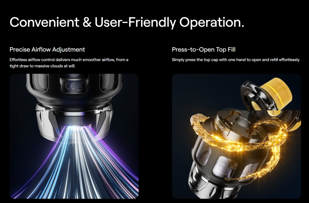 Airflow precision is another highlight. The adjustable airflow control allows you to tailor your draw from tight and flavorful to open and cloud-heavy fully. Combined with the top-filling system, refilling is quick and secure, making everyday use simple and convenient