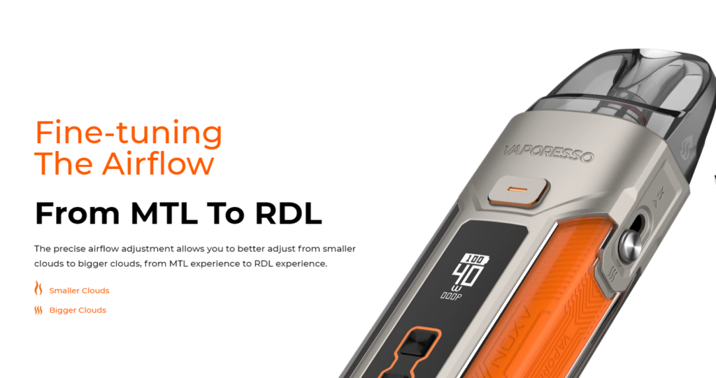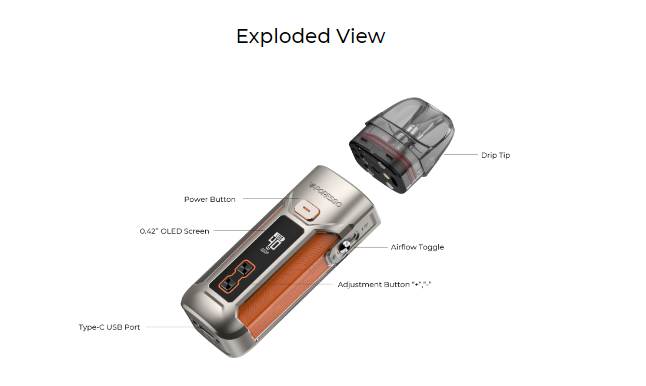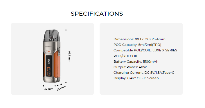 The Luxe X Pro Kit is powered by a built-in 1500mAh battery with a maximum power output of 40W and Type-C charging. It is designed with accurate power/airflow control and lets you tailor your experience from MTL to RDL. The 0.42” OLED panel vividly displays vaping statistics.
