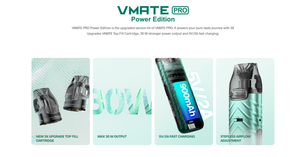 Today, we will introduce a new item – VOOPOO Vmate Pro Kit Power Edition. This latest offering combines cutting-edge technology with a sleek, ergonomic design to elevate your vaping experience to new heights. Whether you’re a seasoned enthusiast or just starting your journey, the Vmate Pro Kit promises a blend of performance, safety, and aesthetic appeal that stands out in the crowded market of vape devices.