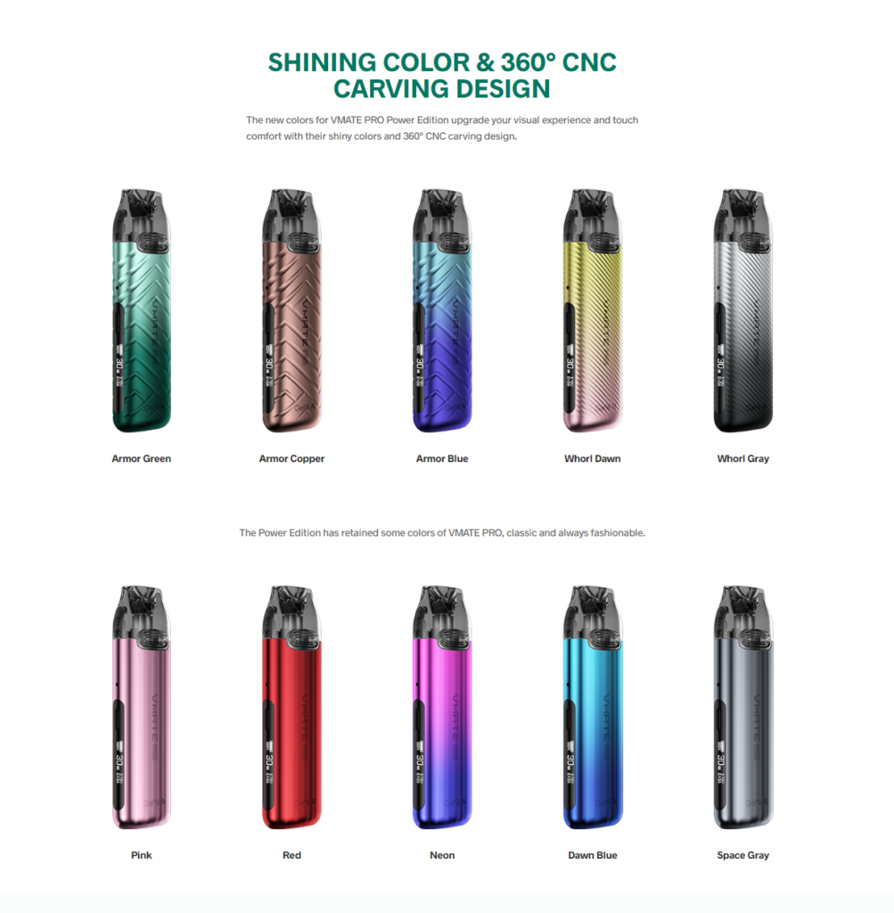 The Vmate Pro Kit Power Edition captivates from the first glance with its striking aesthetic. Featuring a shining array of colors and a meticulously crafted 360° CNC carving design, this device is not just a tool for vaping but a statement piece. The precision of the carving ensures every detail is not only visually appealing but also enhances the ergonomic feel, fitting comfortably in your hand.