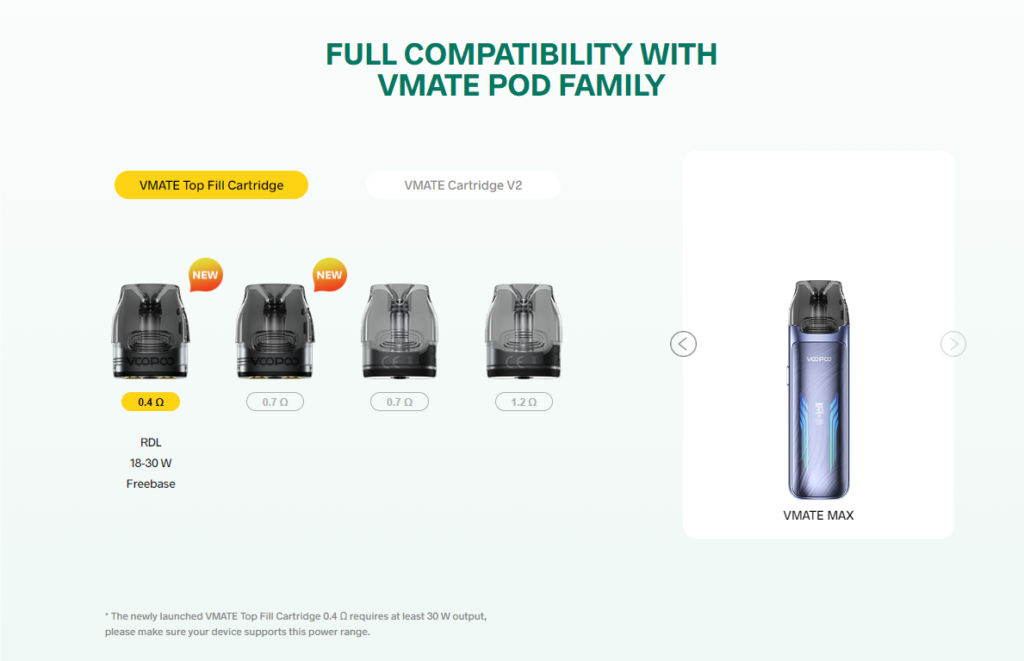 - Cartridge Included: Vmate Top Fill Cartridge 0.4Ω, Vmate Top Fill Cartridge 0.7Ω