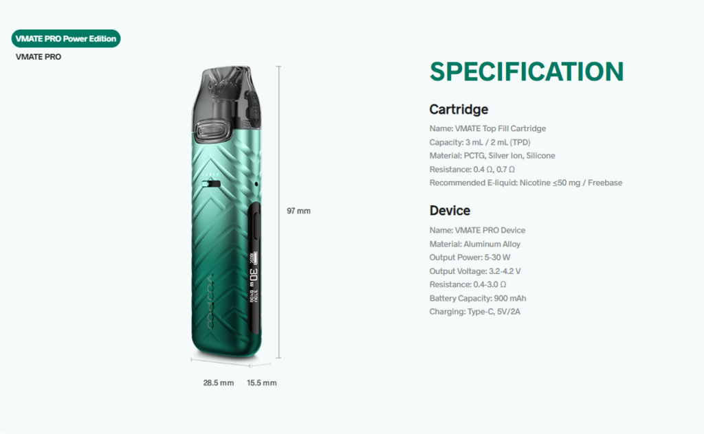 In conclusion, the VOOPOO Vmate Pro Kit Power Edition sets a new standard in the realm of vaping devices. With its stunning design, seamless compatibility with the Vmate Pod Family, and robust safety features, it caters to both style-conscious users and those prioritizing safety. Whether you’re drawn to its aesthetic appeal or its reliable performance, the Vmate Pro Kit Power Edition offers a balanced vaping experience that enhances every aspect of your journey. Discover the future of vaping with VOOPOO and elevate your experience today.
